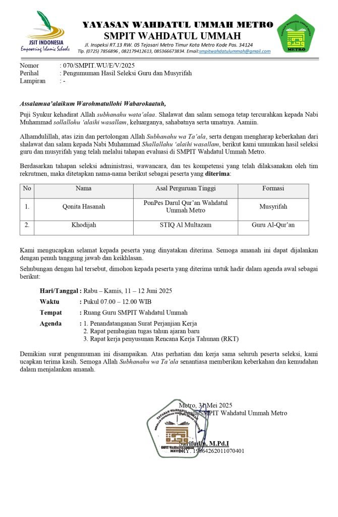 Pengumuman Seleksi Guru Al Qur’an dan Musyrif/Musyrifah Ahmad 2 Juni 2025 Tak Berkategori 0 Komentar Navigasi pos Previous Previous post: SMPIT Wahdatul Ummah Buka Penerimaan Peserta Didik Baru Tahun Ajaran 2025/2026Next Next post: SMPIT WAHDATUL UMMAH GELAR WISUDA ALQUR’AN DAN LEPAS SISWA ANGKATAN 6 Tinggalkan Balasan Batalkan balasanAlamat email Anda tidak akan dipublikasikan. Ruas yang wajib ditandai *Komentar * Nama * Email * Situs Web Simpan nama, email, dan situs web saya pada peramban ini untuk komentar saya berikutnya.